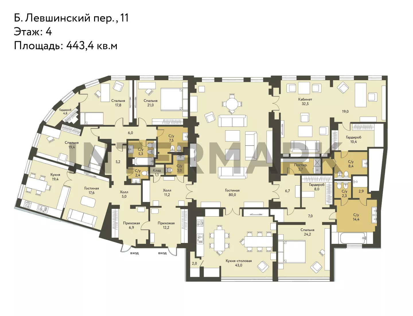 Buy 7-rooms apartment 443.4 sq.m, 4 floor, Bolshoy Lyovshinsky Lane, 11, RC Dvoryanskoe Gnezdo
