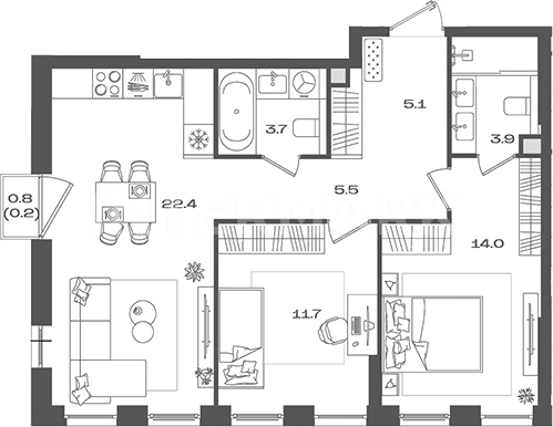 2-rooms apartment, 2nd Paveletsky Drive, 4/6, RC PAVE, 66.5 sq.m, 6 floor, ID 17240015761
