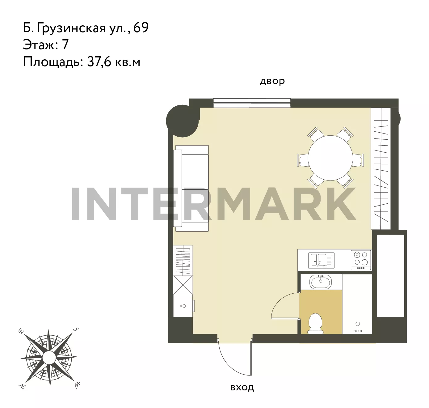 Комфортная квартира-студия в элитном ЖК Четыре Ветра в районе Тверской. Выполнена отделка в современной лаконичной классике в теплой белоснежно-бежевой гамме. Квартира укомплектована бытовой техникой (встроенный холодильник, индукционная плита, стиральная машина), установлена система кондиционирования, предусмотрен подогрев полов. Панорамное окно обращено во внутренний двор жилого комплекса. Планировка включает вместительную кладовую комнату и полноценную ванную комнату.