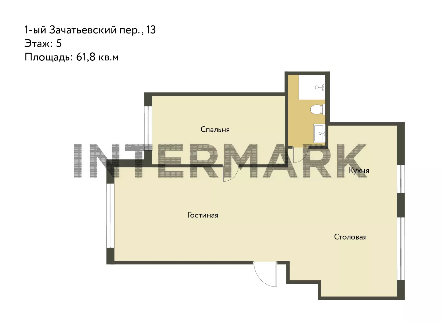 Общая площадь 61,8 кв.м: гостиная с балконом, кухня с обеденной зоной, спальня, душевая комната с хозблоком.