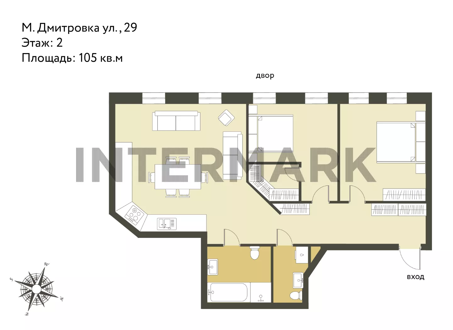 Трехкомнатная квартира с редкой высотой потолков 3,6 метров в историческом доме с железобетонными перекрытиями на Малой Дмитровке. Спланированы просторная зона кухни-гостиной, 2 спальни, ванная комната, гостевой с/у. Изюминка квартиры – в каждой комнате по 2 высоких окна с видами во внутренний двор дома.