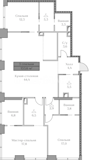 Купить 3-комнатную квартиру, Лужнецкая набережная, 2/4с1, ЖК Collection Luzhniki (Коллекция Лужники), 133.6 кв.м, 16 этаж, ID 12550016217