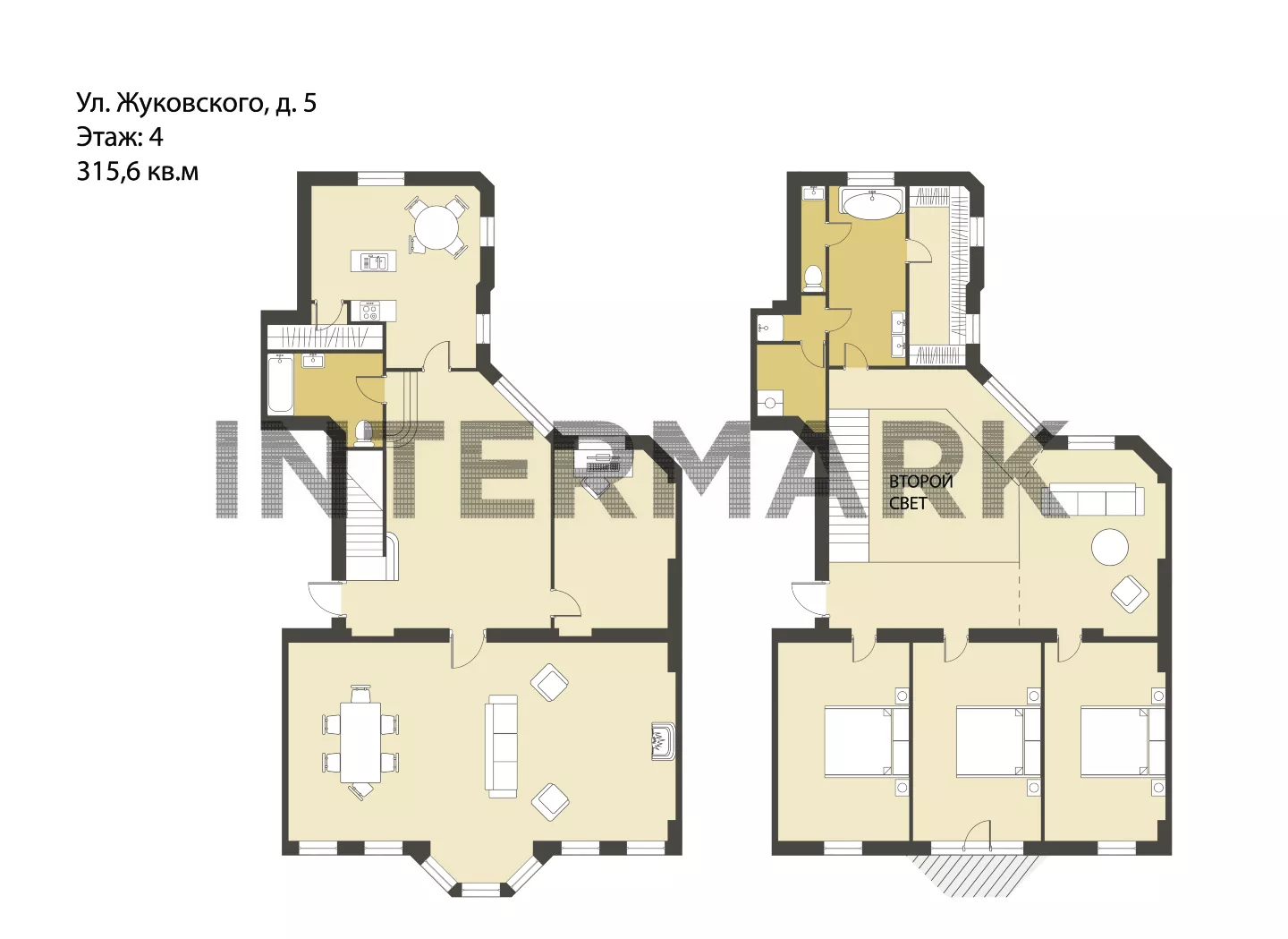 Невероятно красивая квартира с уникальной планировкой и дизайнерской отделкой. Квартира расположена на двух верхних этажах фасадного особняка. На первом уровне расположены - просторная светлая гостиная, уютная кухня, ванная комната и рабочий кабинет. На втором уровне – три спальни, ванная и гардеробная. Уровни соединены между собой роскошной парадной лестницей со вторым светом. Высота потолков – 3,5м в жилых пространствах и до 6м в зоне второго света.