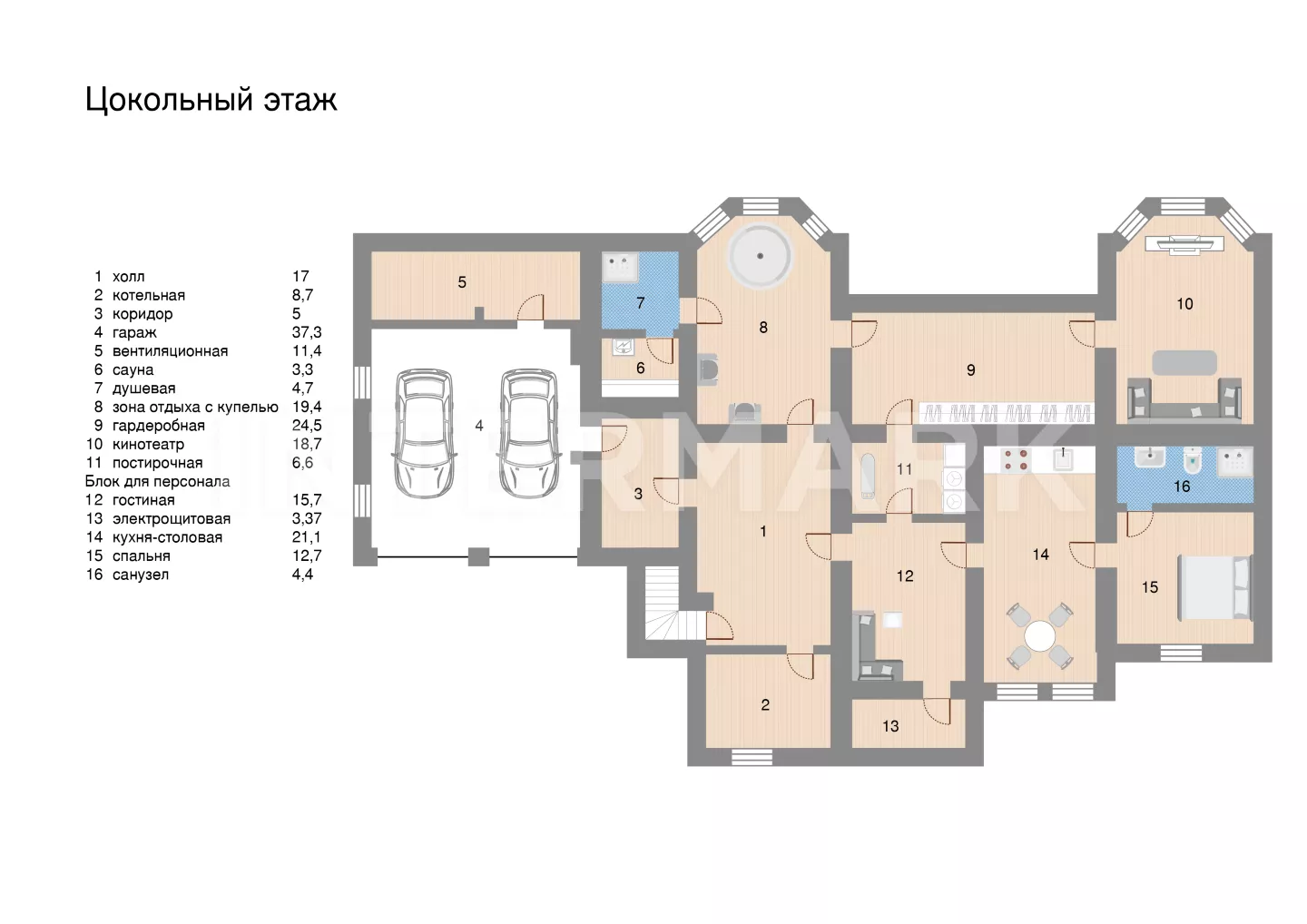 Цоколь: гараж на 2 м\м, рабочая кухня, спа-зона: сауна с купелью, комната отдыха, раздевалка и с\у, спортзал, кинотеатр, кладовые, комната управляющего с с\у и душевой, котельная