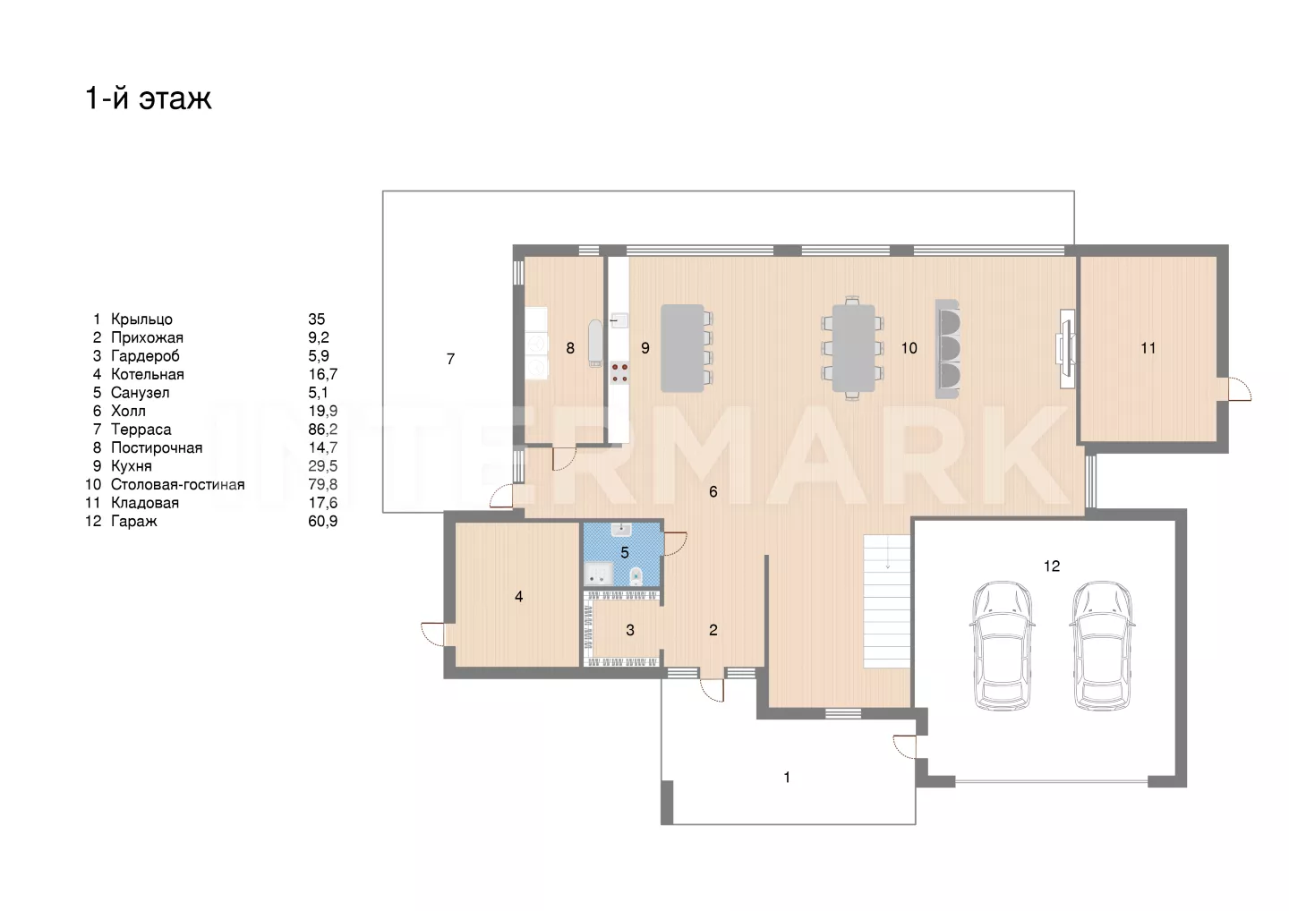 1 этаж: прихожая, кухня-гостиная-столовая, гардеробная, с/у, постирочная, котельная, кладовая, гараж на 2 м/м