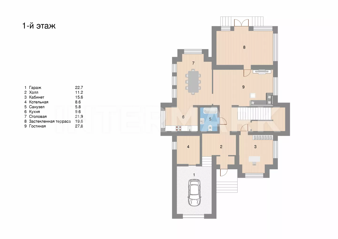 1 этаж: холл, кухня-столовая, гостиная, кабинет, санузел, кладовая, гараж, котельная