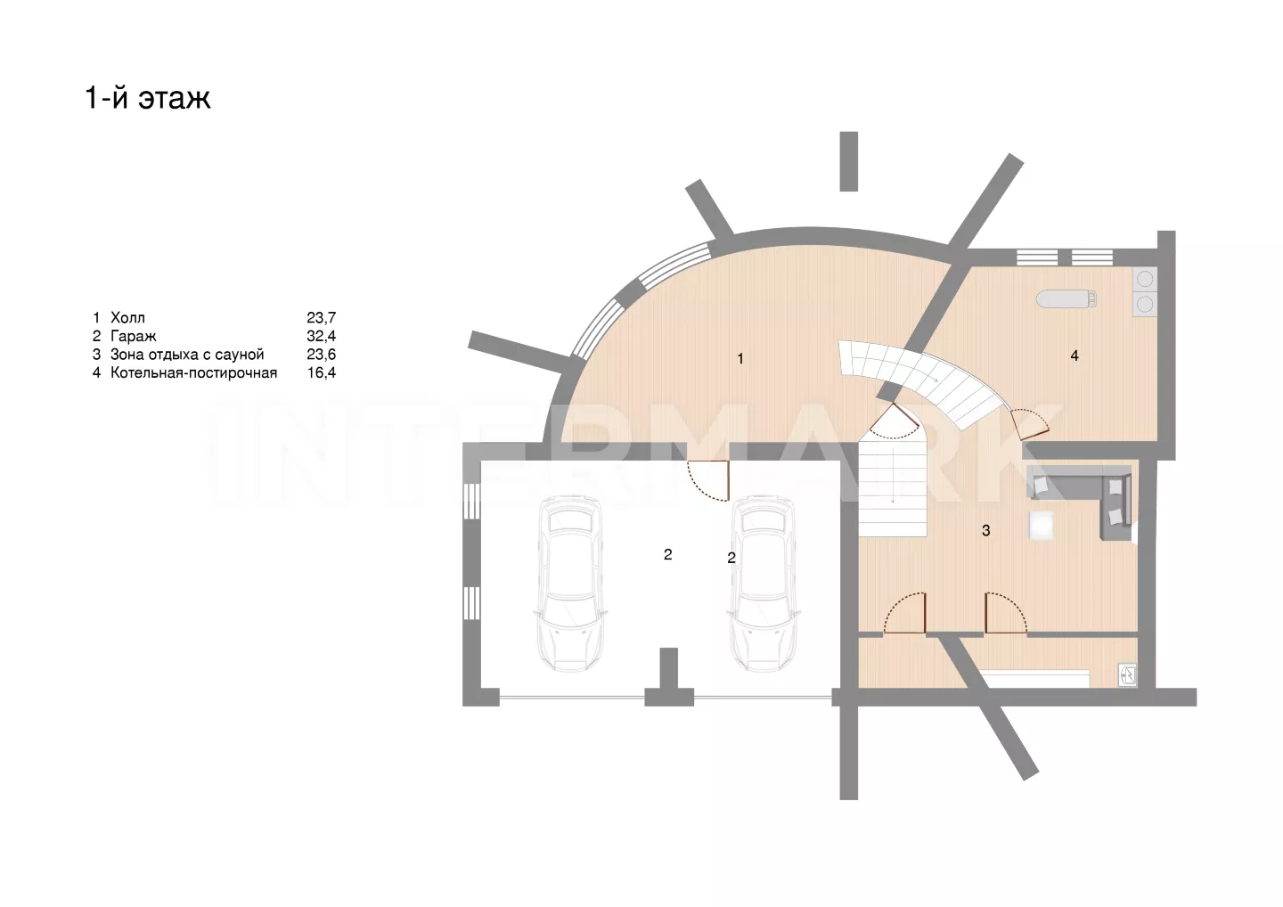 1 этаж: холл, комната отдыха, сауна, кладовая, котельная-постирочная, гараж на 2 м/м