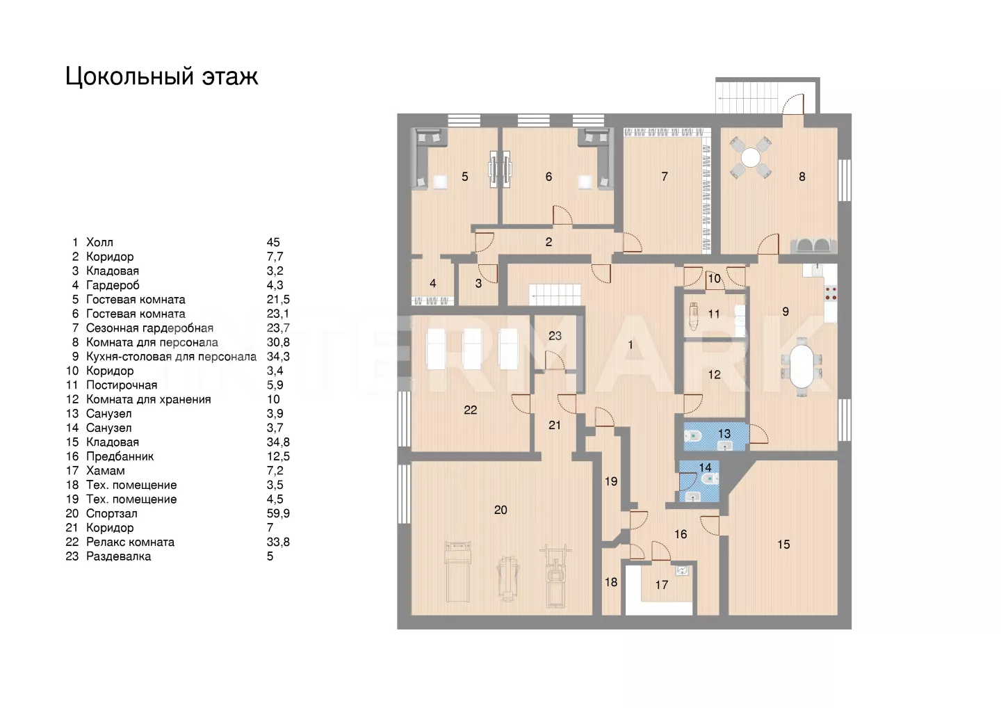 В цоколе дополнительные возможности для отдыха и хранения. Здесь расположены спа-зона, помещения для хранения, две дополнительные спальни, два санузла и постирочная. Также предусмотрена квартира для персонала с отдельным входом, что добавляет удобства и приватности.