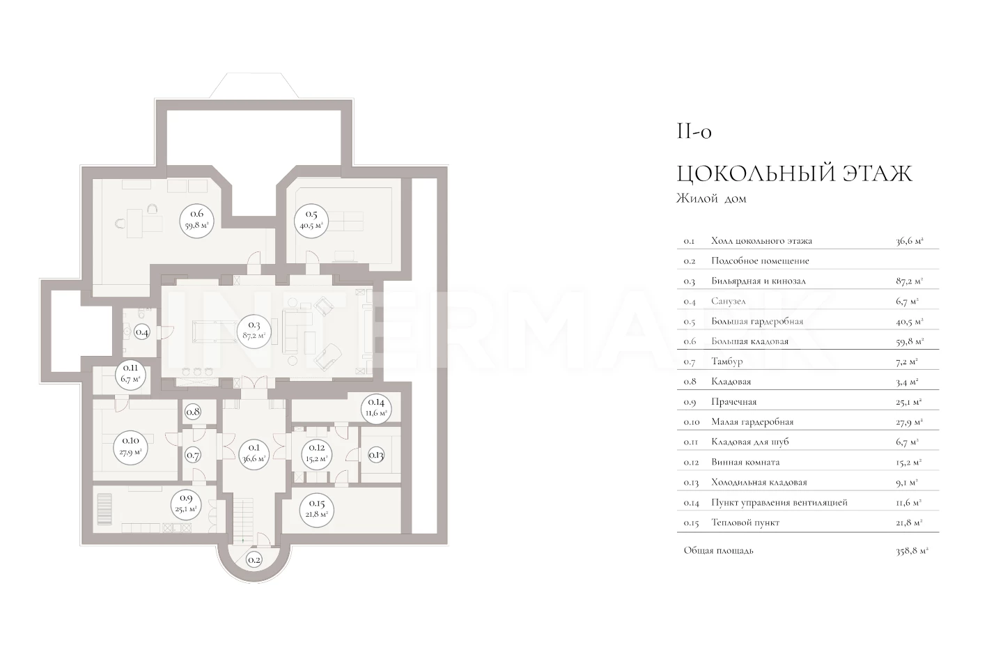 Цоколь: холл, подсобные помещения, бильярдная и кинозал, с/у, большая гардеробная, большая кладовая, тамбур, кладовая, прачечная, малая гардеробная, кладовая для шуб, винная комната, холодильная кладовая, пункт управления вентиляцией, тепловой пункт