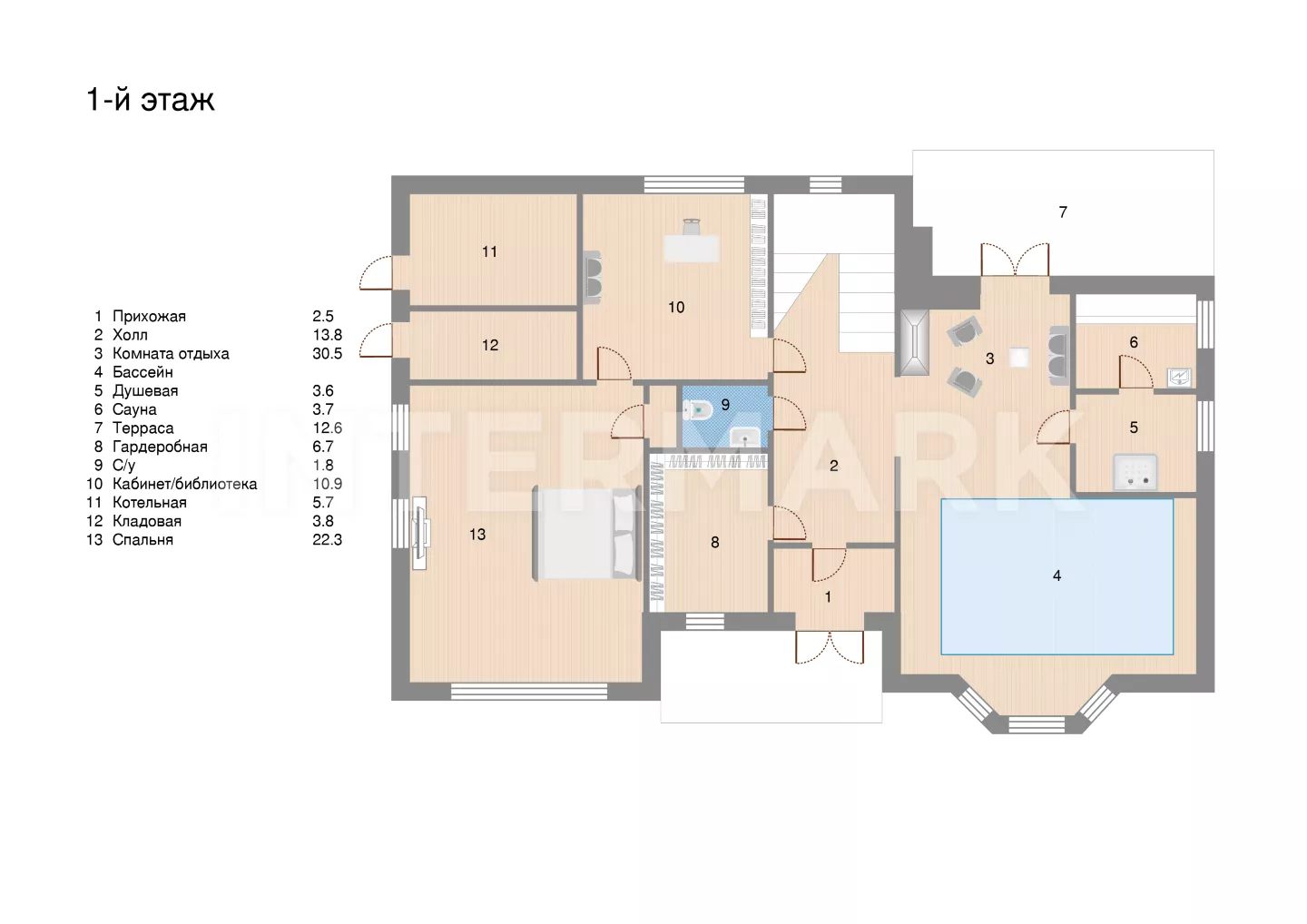 1 этаж: спальня, кабинет-библиотека, санузел, веранда, зона SPA – купель, сауна, душевая, котельная, хоз. комната