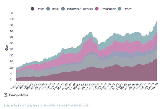 Скользящий объем транзакций за последние двенадцать месяцев впервые превысил отметку в 100 млрд евро и в конце первого квартала составил 102,2 млрд евро (см. График ниже).