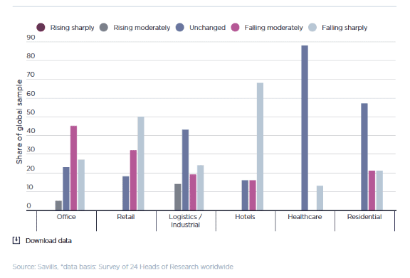 Кризис приведет к снижению объемов транзакций во всех сегментах недвижимости, но эффект, скорее всего, будет разным. 31 марта 2020 года отделы исследований Savills в 24 странах мира провели опрос, и, поскольку кризис носит глобальный характер, часть информации относится и к Германии. Согласно опросу, наиболее резкое снижение объема транзакций будет происходить в сегменте отелей, за которыми следуют торговые и, в некоторой степени, офисные объекты. Наименьшее влияние ожидается в секторе логистики, здравоохранения и жилой недвижимости (см. График ниже).