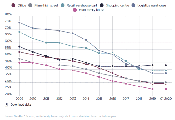 С объемом 26,7 млрд евро, это самый сильный первый квартал всех времен, но он также ознаменует конец десятилетнего циклического подъема на рынке инвестиций в недвижимость Германии. В результате пандемии COVID-19 в ближайшие недели и месяцы ожидается значительное снижение активности сделок. Транзакции, которые уже находились на продвинутой стадии, часто все еще завершаются. Однако в настоящее время вряд ли начнутся процессы по новым сделкам. Хотя, безусловно, есть инвесторы, которые хотят продолжать покупать даже в нынешних условиях, эти инвесторы также сталкиваются с практическими препятствиями, такими как ограничения на физические контакты. Многие другие инвесторы временно приостановили свои планы покупки и хотят в ближайшие недели сориентироваться и выработать новые стратегии.