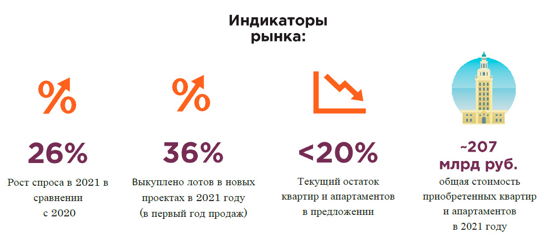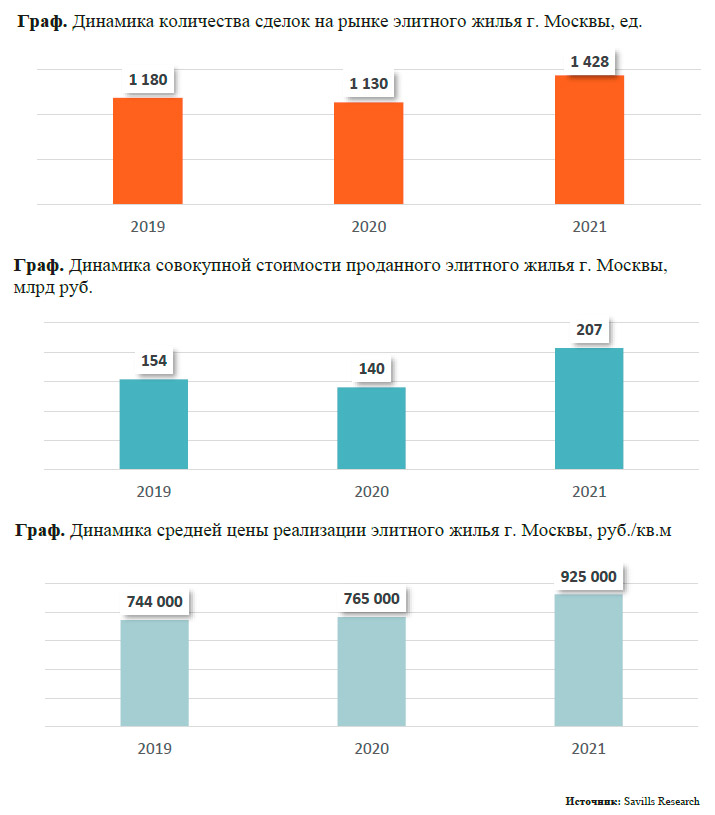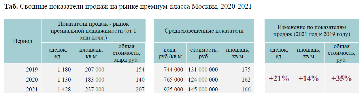 В целом за 2021 год на рынке премиальных новостроек и вторичного жилья Москвы было приобретено почти 1 430 квартир и апартаментов стоимостью свыше 1 млн долл. США, т.о. спрос на жилье в данном сегменте увеличился почти на 21% по сравнению с 2019 годом и на 26% по сравнению с прошлым годом.