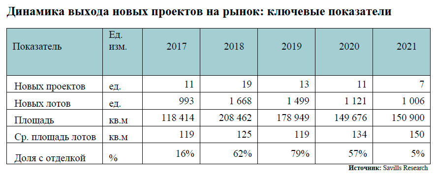 По составу новые проекты 2021 отличаются от прошлогодних в первую очередь малой долей лотов с отделкой – доля таких вариантов в общей структуре стала лишь 5%. В то же время средняя площадь квартир и апартаментов наоборот увеличилась с 134 до 150 кв.м.