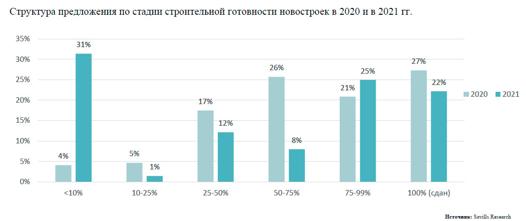 В структуре первичного предложения по стадии строительной готовности заметно увеличилась доля квартир и апартаментов на начальном этапе, где теперь сосредоточено 31% объема предложения.
