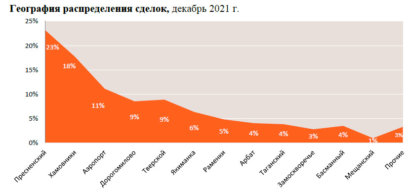 С точки зрения территориального распределения наибольшее число сделок было зафиксировано традиционно в Пресненском районе и Хамовниках – около половины из числа всех сделок (по 23% и 18% соответственно).