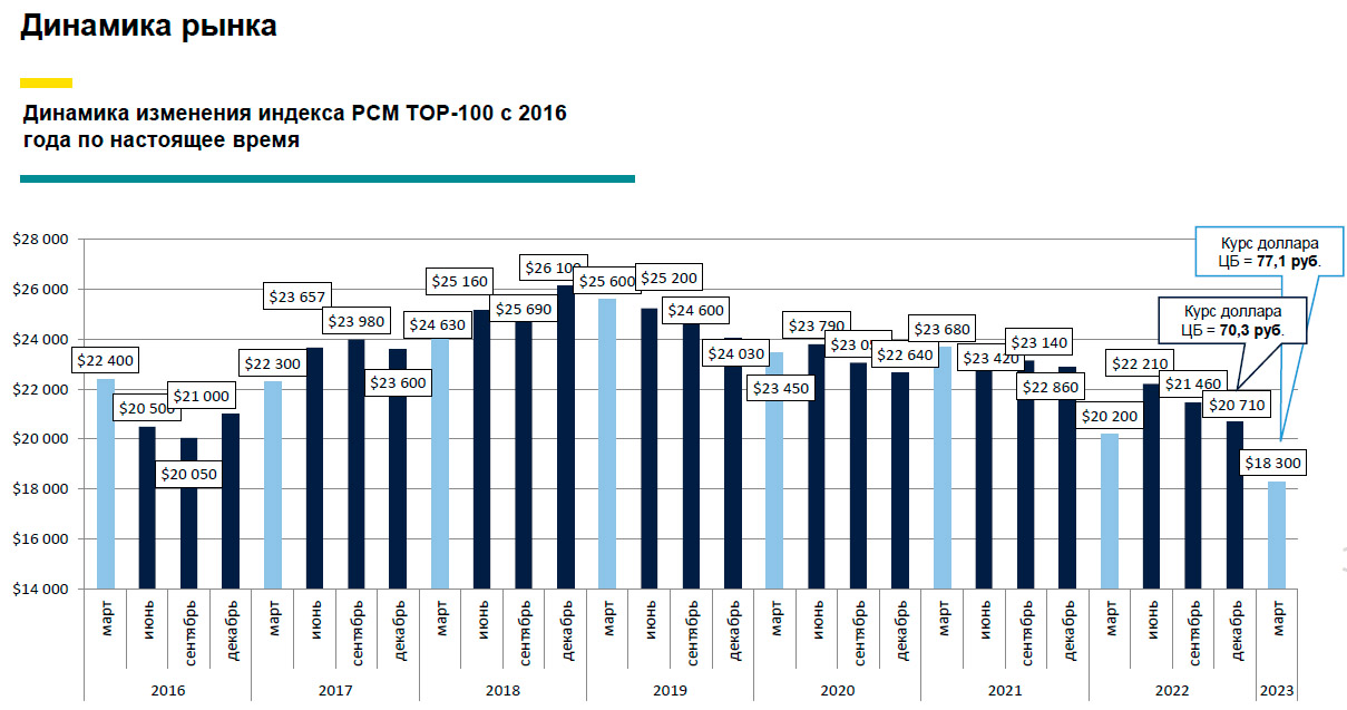 - За последний квартал индекс PCM TOP-100 уменьшился на 13% в долларом эквиваленте, при этом в рублях средняя ставка аренды 100 самых дорогих квартир в Москве осталась примерно на том же уровне, что и в начале года. Основной причиной снижения ставок аренды в долларах стало ослабление рубля – так, с начала января по март курс доллара США увеличился на 10% с 70,3 до 77,1 руб./долл. (на 31.03.2023 по данным ЦБ).