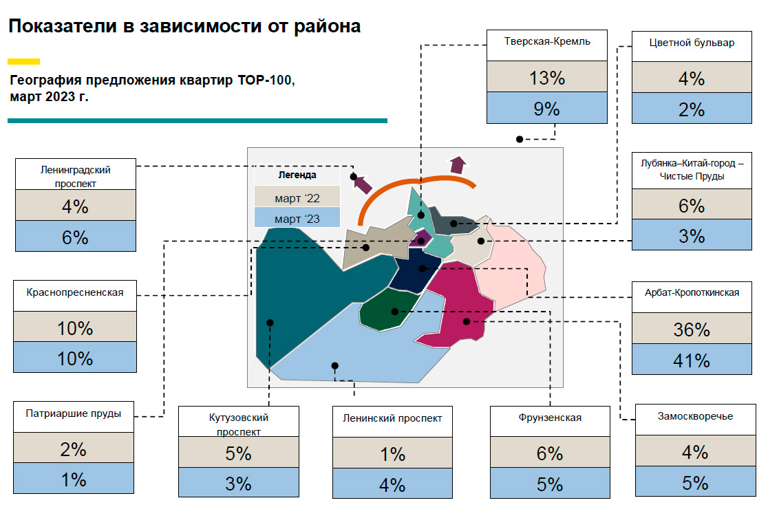 - Мы отмечаем тенденцию увеличения премиальных предложений в первом квартале 2023 года в сравнении с аналогичным периодом прошлого года в районах Арбат-Кропоткинская и Тверская-Кремль – за последний год доля присутствия в первой локации повысилась на 5 п.п., тогда как во второй наоборот понизилась 4 п.п..