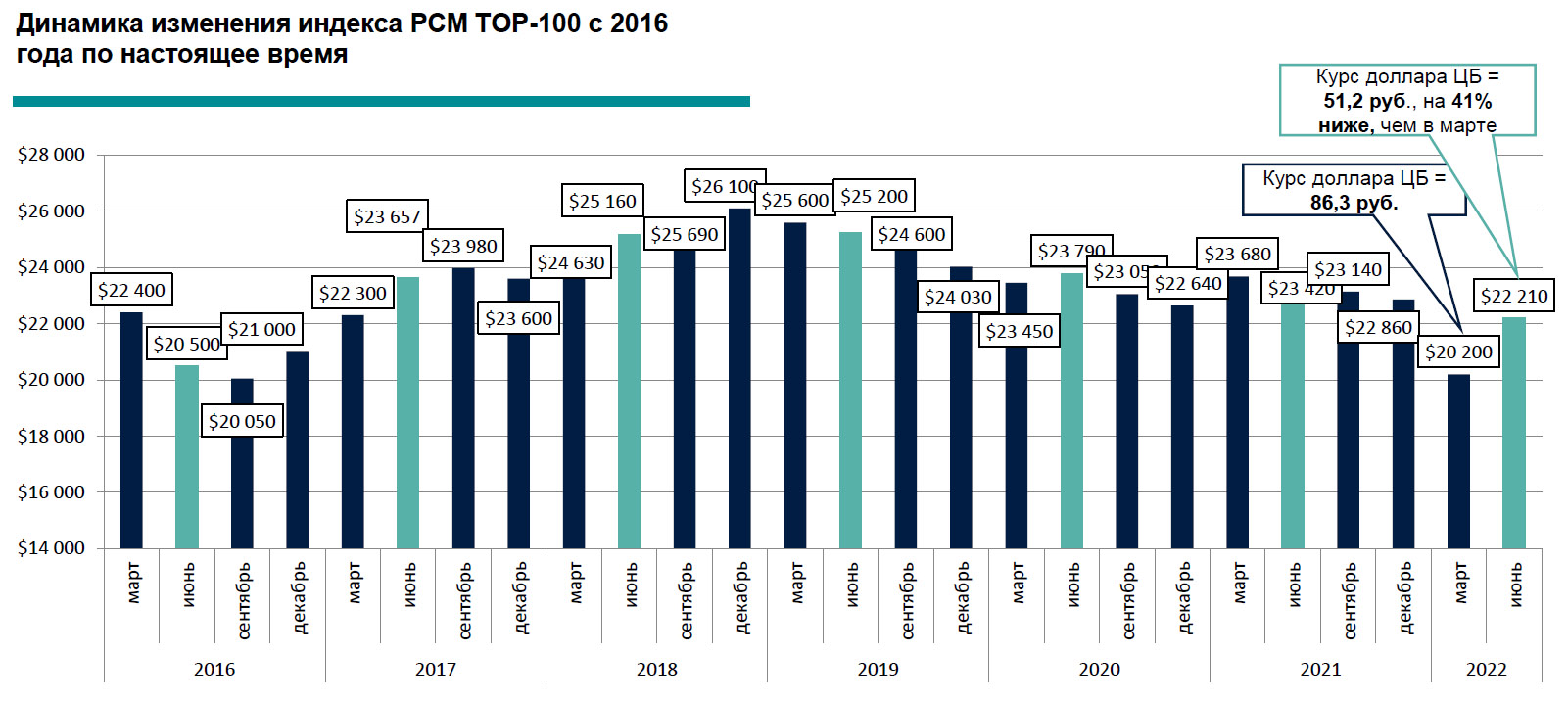 По результатам первого полугодия 2022 года значение индекса PCM TOP-100 для рынка высокобюджетной аренды Москвы составило $22 200 за объект в месяц