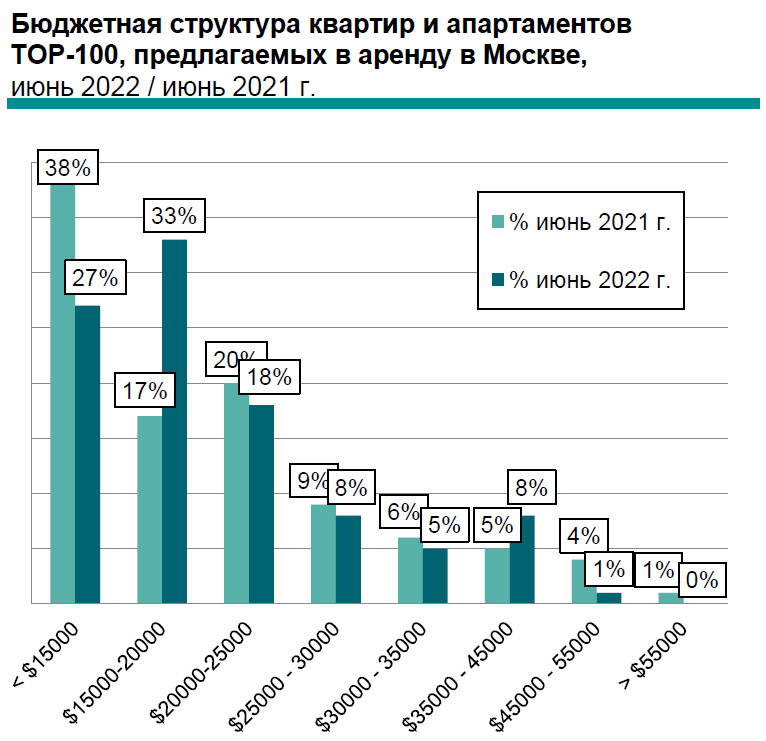 - За последние пол года первая сотня самых дорогих квартир на рынке высокобюджетной аренды Москвы обновилась более чем на четверть (на 28%). Выбывшие из рейтинга квартиры были сняты с реализации либо сданы в аренду, а их места были заняты другими дорогостоящими предложениями.