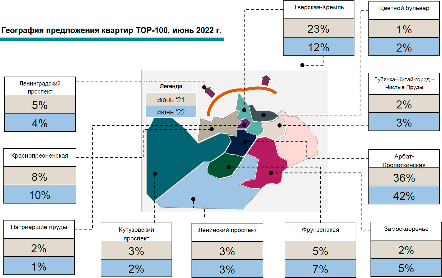 - Мы отмечаем тенденцию уменьшения премиальных предложений по итогам первого полугодия 2022 года в сравнении с аналогичным периодом прошлого года в районе Тверская-Кремль: за последний год доля присутствия данного района снизилась на 11 п.п. с 23% до 12%.