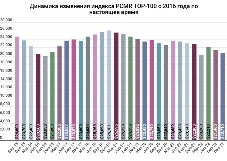 По результатам 2022 года значение индекса PCMR TOP-100 для рынка высокобюджетной аренды Москвы составило $20 710 за объект в месяц