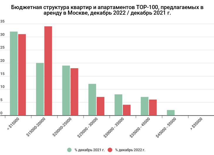 - Если анализировать изменение ценовой структуры TOP-100 самых дорогих квартир в аренду в целом за последний год, то можно отметить следующую картину: увеличение количества лотов на 14% в диапазоне от $15 000 до $20 000 за объект в месяц (с 20% до 34%) и наоборот уменьшение числа более дорогих объектов по ставкам от $25 000 до $35 000 за объект в месяц на 9%.