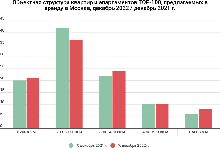 - Наблюдается снижение доли в предложении вариантов от 200 до 300 кв.м – за последний год на 6% уменьшилась доля квартир такой площадью. Средняя площадь предлагаемого лота из рассматриваемого рейтинга на январь 2023 года составила 308 кв.м. Таким образом, в целом структура по площадям осталась прежней без резких колебаний.