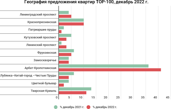 - Мы отмечаем тенденцию увеличения премиальных предложений по итогам 2022 года в сравнении с аналогичным периодом прошлого года в районе Арбат-Кропоткинская: за последний год доля присутствия данного района повысилась на 5 п.п. с 36% до 41%.
