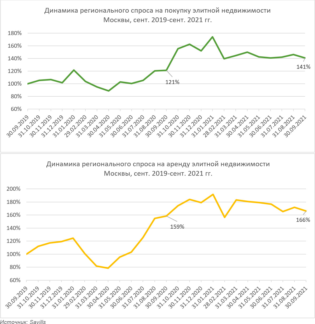 Международное агентство элитной недвижимости Savills проанализировало спрос из регионов России на элитную недвижимость в Москве. Аналитики отмечают рост интереса региональных покупателей и арендаторов к высокобюджетному жилью столицы с момента снятия ограничительных мер, вызванных COVID-19 в 2020 году. Региональный спрос продолжает оставаться высоким и в 2021 году, - так, по итогам сентября в сравнении с допандемийным сентябрем 2019 года, спрос на покупку недвижимости из регионов вырос больше, чем на треть - в 1,4 раза, а на аренду почти вдвое - в 1,7 раз.