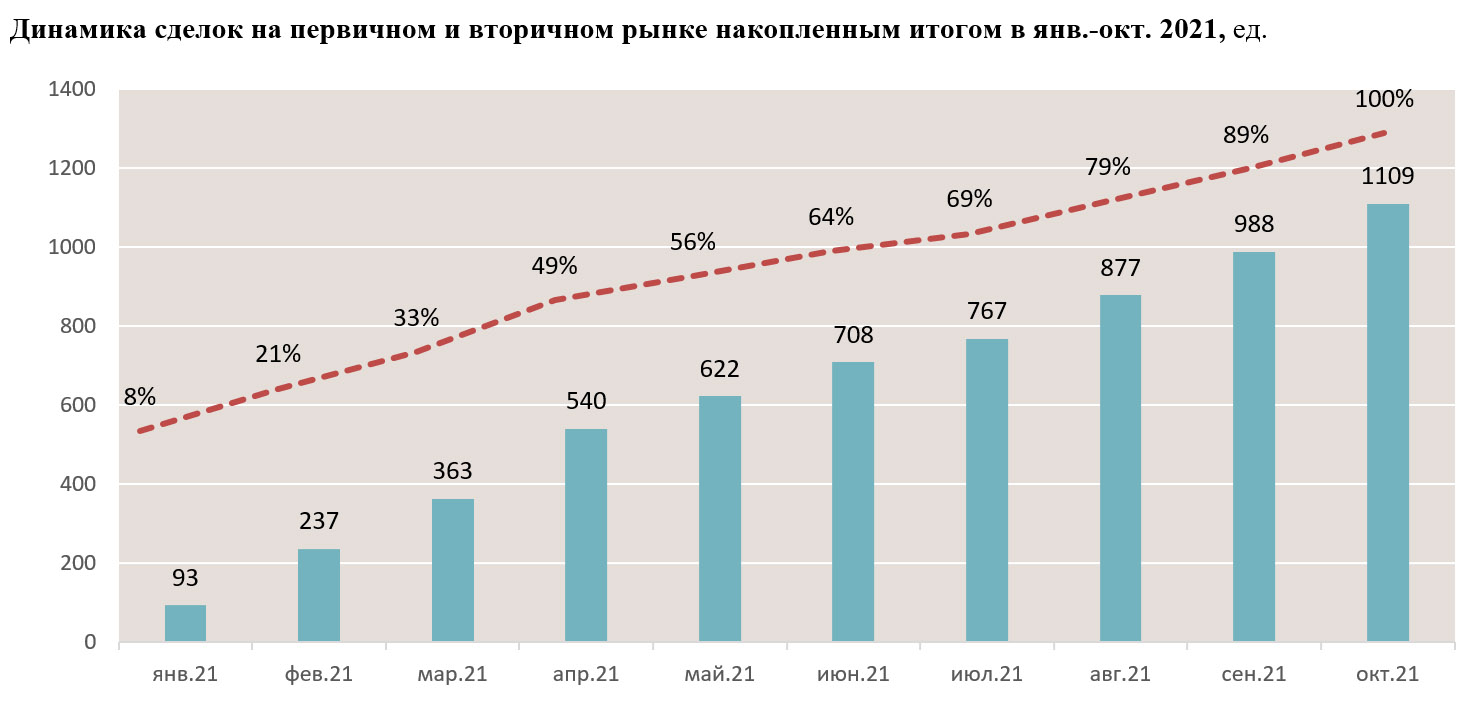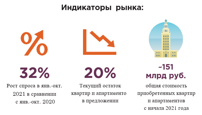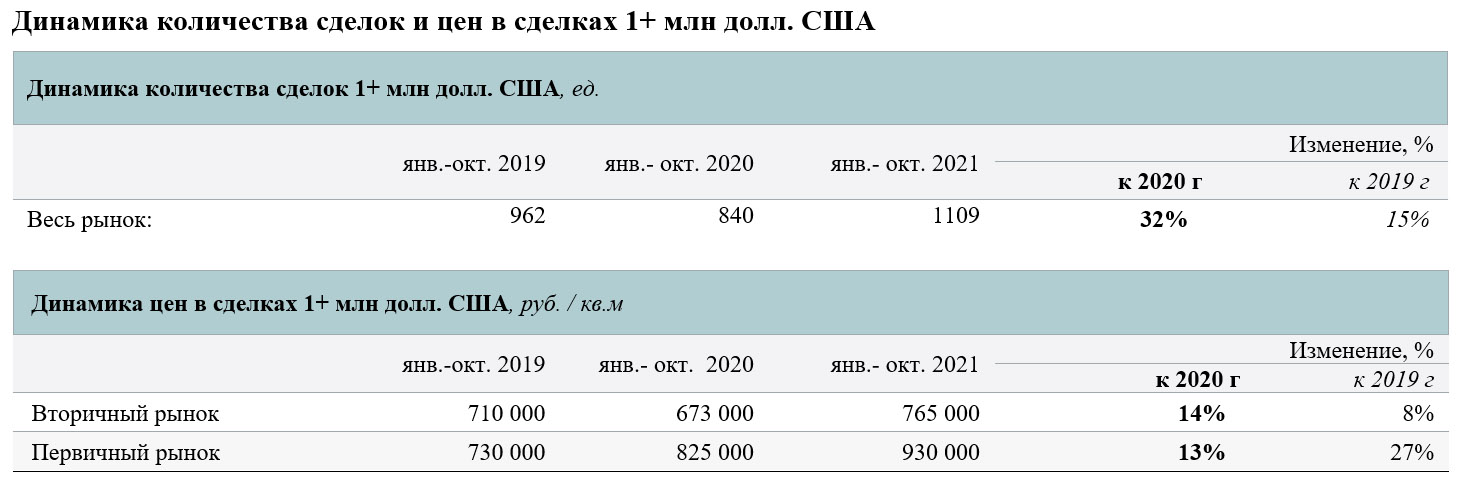 В целом с января по октябрь 2021 года на рынке премиальных новостроек и вторичного жилья Москвы было приобретено более 1100 квартир и апартаментов стоимостью свыше 1 млн долл. США, т.о. спрос на жилье в данном сегменте увеличился почти на треть по сравнению с аналогичным периодом 2020 года.