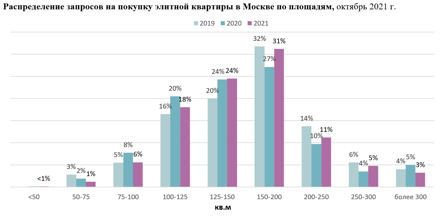 Сохраняется высокий интерес покупателей и к просторным квартирам площадью более 200 кв.м – около 20% клиентов выбирают недвижимость такой площади.