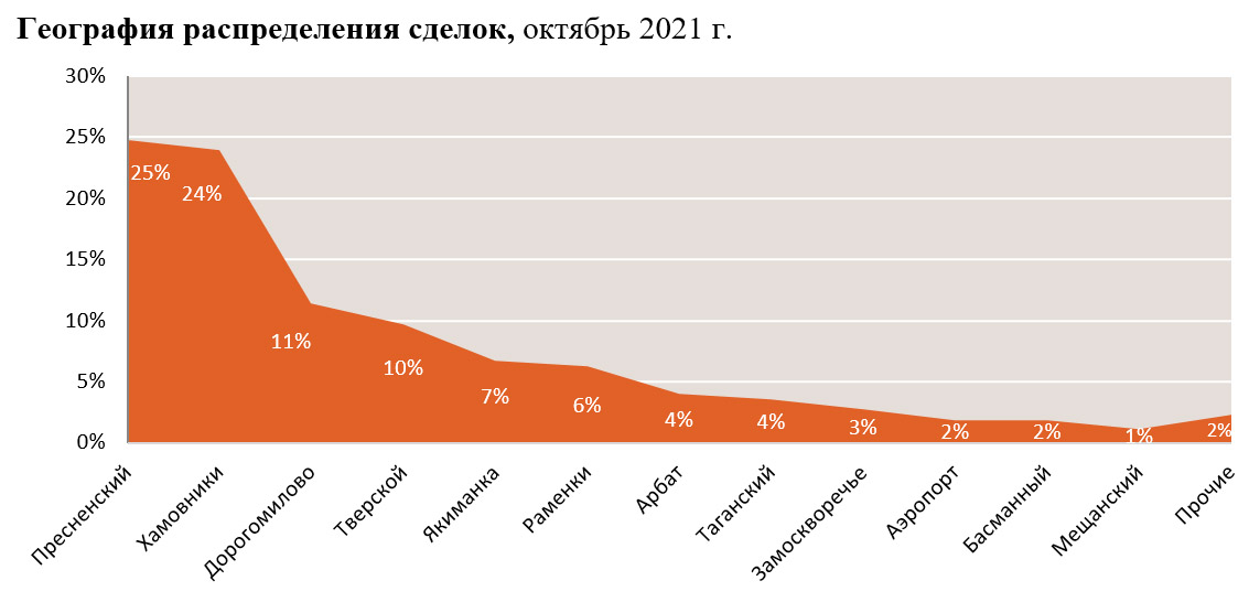 С точки зрения территориального распределения наибольшее число сделок было зафиксировано традиционно в Пресненском районе и Хамовниках – около половины из числа всех сделок (по 25% и 24% соответственно).