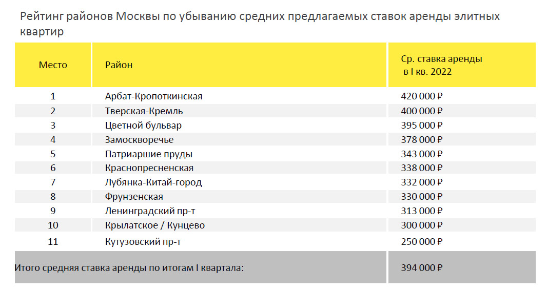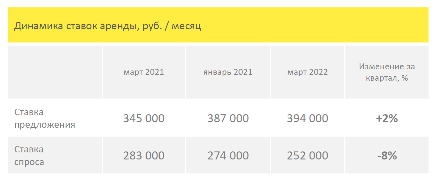 По данным на начало апреля 2022 средневзвешенный бюджет предложения на рынке высокобюджетной аренды Москвы остался почти без изменений и составил 394 000 руб. за объект в месяц.