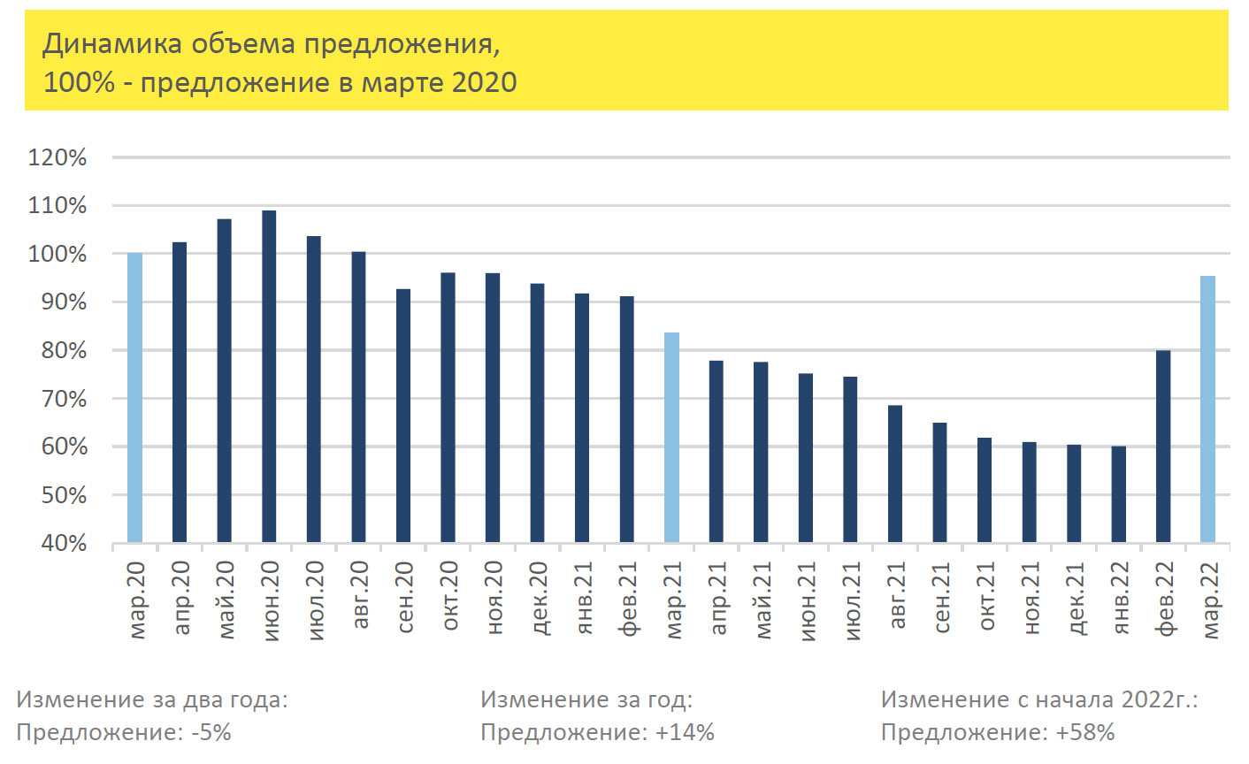 На данный момент мы отмечаем рекордный объем предложения – последний раз более широкий выбор квартир был в ноябре 2020 года.