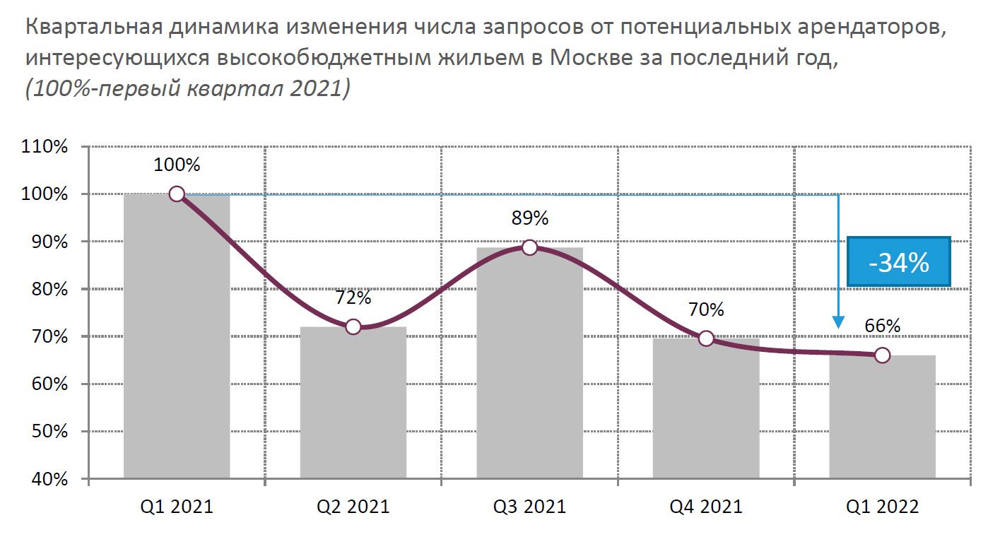 С началом весны количество запросов на аренду сократилось на 19% в сравнении с концом прошлого года. Если сравнивать совокупный спрос за первый квартал 2022 года и аналогичный период прошлого года, то можно отметить уменьшение числа обращений на аренду элитных квартир примерно на треть (-34%). Тем не менее, по сравнению с первым кварталом 2020 года, число сделок выросло на 10%.