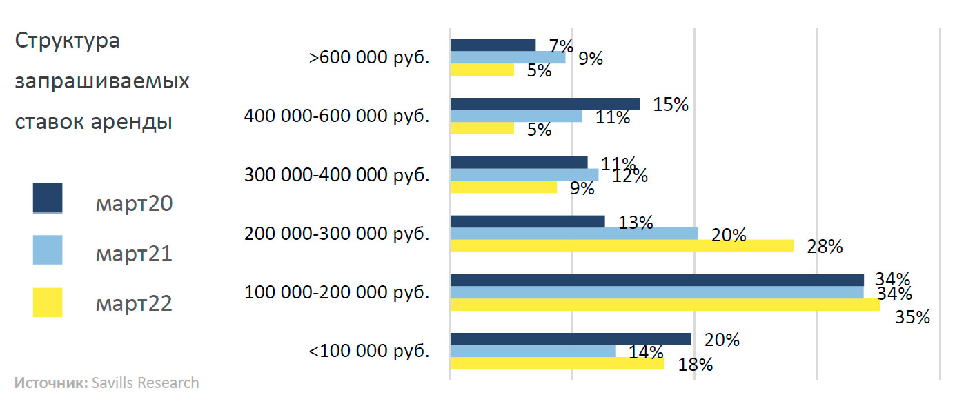 Наиболее популярный диапазон ставок аренды у клиентов – от 100 000 до 200 000 руб. за объект/месяц. Квартирами с таким бюджетом интересуется более трети (35%) арендаторов. За последний год доля дорогих квартир по ставкам свыше 400 000 руб. за объект/месяц снизилась на 10 п.п., тогда как доля спроса на недвижимость в диапазоне 200 000-300 000 руб. за объект/месяц выросла на 8 п.п.