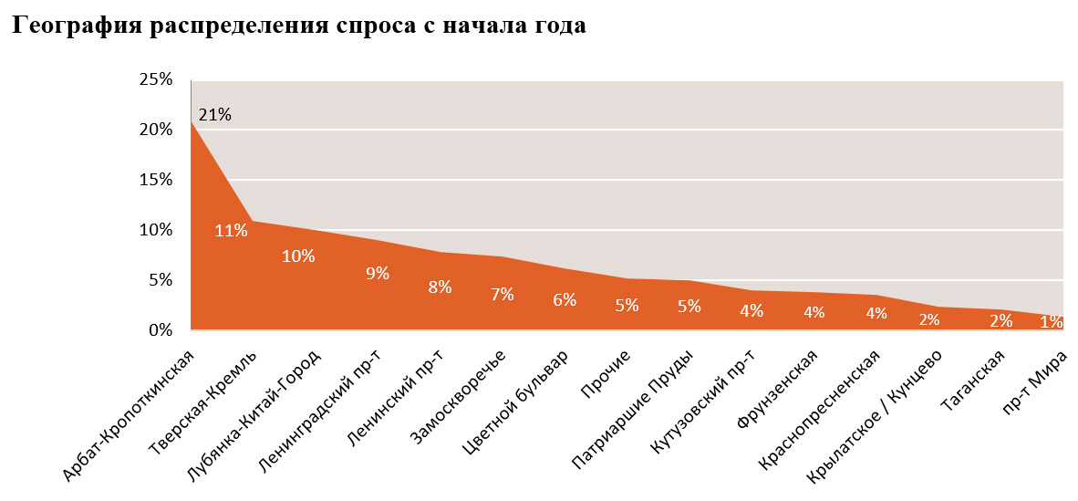 С точки зрения территориального распределения наибольшее число сделок по аренде в январе-октябре 2021 года зафиксировано традиционно в локации Арбат-Кропоткинская (21%). На втором месте по популярности среди клиентов – район Тверская-Кремль (11% спроса). На локации Лубянка-Китай-Город-Чистые пруды и Ленинградский проспект пришлось по 10% и 9% спроса соответсенно.