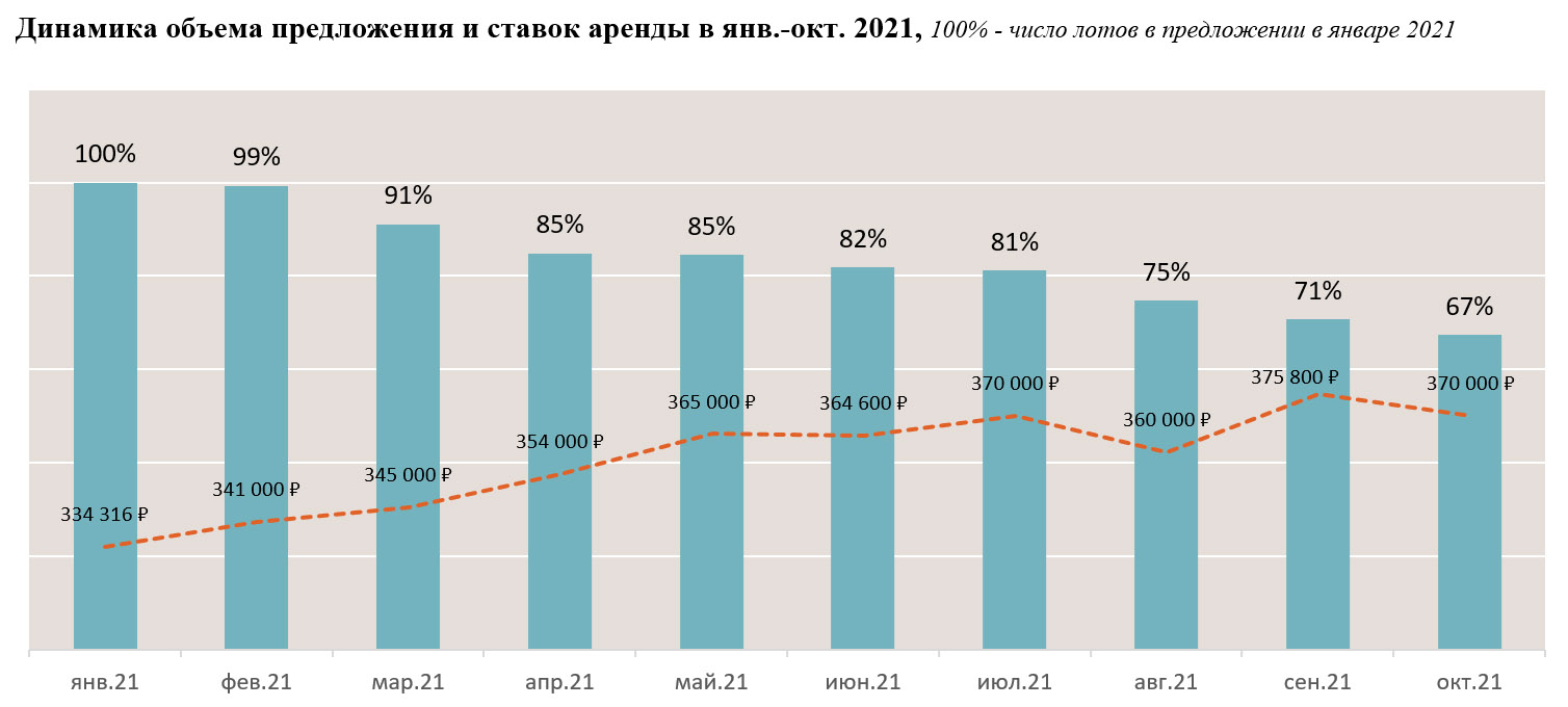 Средняя предлагаемая ставка аренды увеличилась с начала года на 11% и составила 370 000 руб. за объект в месяц. За тот же период ставка спроса осталась примерно такой же, что и в январе 2021, увеличившись с 282 000 до 285 000 руб. за объект в месяц.
