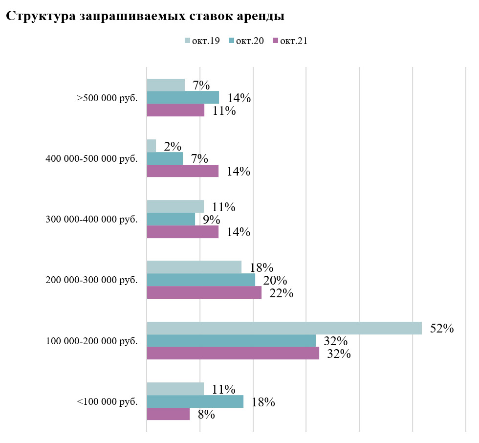 Доля спроса в менее высоком бюджете наоборот уменьшилась – если в октябре 2019 года доля сделок по аренде по ставкам 100-200 000 руб. за объект/месяц составляла около половины спроса, то сейчас в таком бюджете заключается около трети из числа всех сделок (см. график).