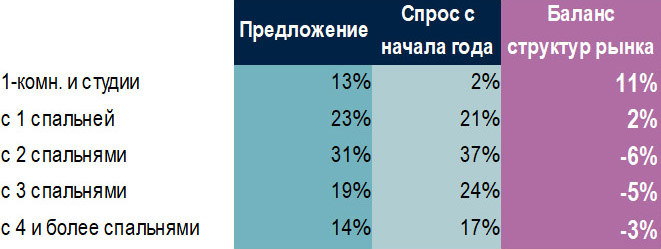 При этом мы отмечаем наоборот профицит предложений в аренду 1-комнатных лотов и студий: 13% занимают такие варианты в структуре предложения и лишь 2% в структуре спроса.
