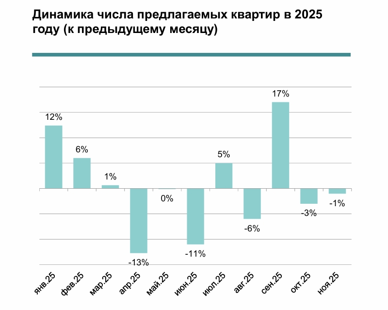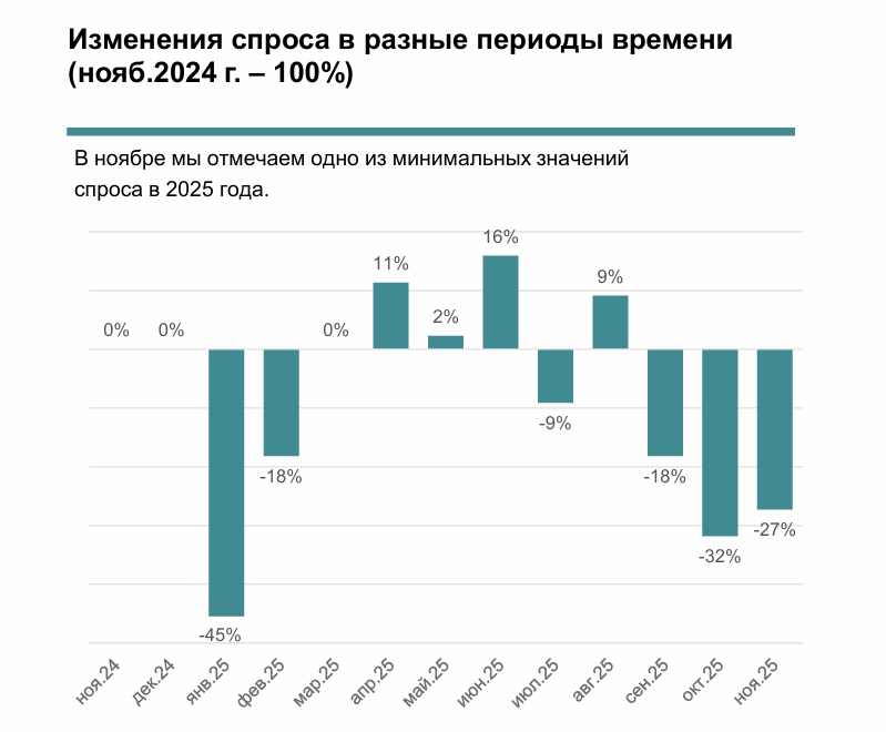 В конце года снова наблюдается тенденция снижения числа сделок и в ноябре мы отмечаем одно из самых минимальных значений спроса в 2025 году.