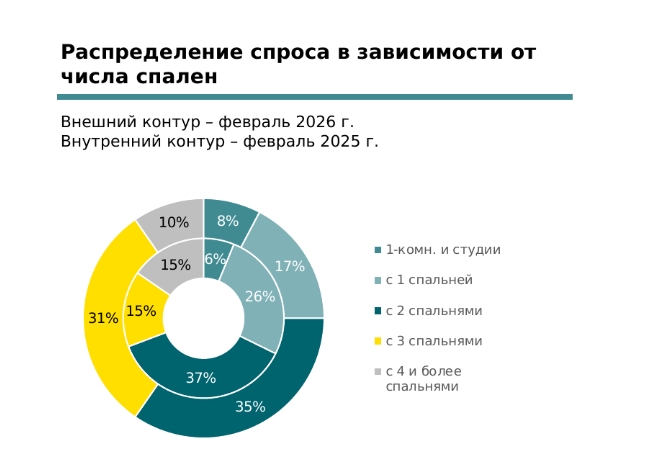 Несмотря на сезонное незначительное снижение спроса в январе 2026 года в сравнении с декабрем, число сделок было повышенным для этого периода – относительно января прошлого года прирост составил 13%. В феврале этого года интерес к аренде высокобюджетных квартир увеличился с января на 7%.