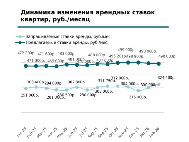 Последние месяцы предлагаемые ставки аренды держатся на стабильном уровне, тогда как средняя ставка аренды со стороны спроса показала рост за февраль на 8%, достигнув 324 400 руб./месяц, при этом цена за 1 кв.м так же увеличилась (на 7% с 2 482 до 2 660 руб./кв.м/месяц).
