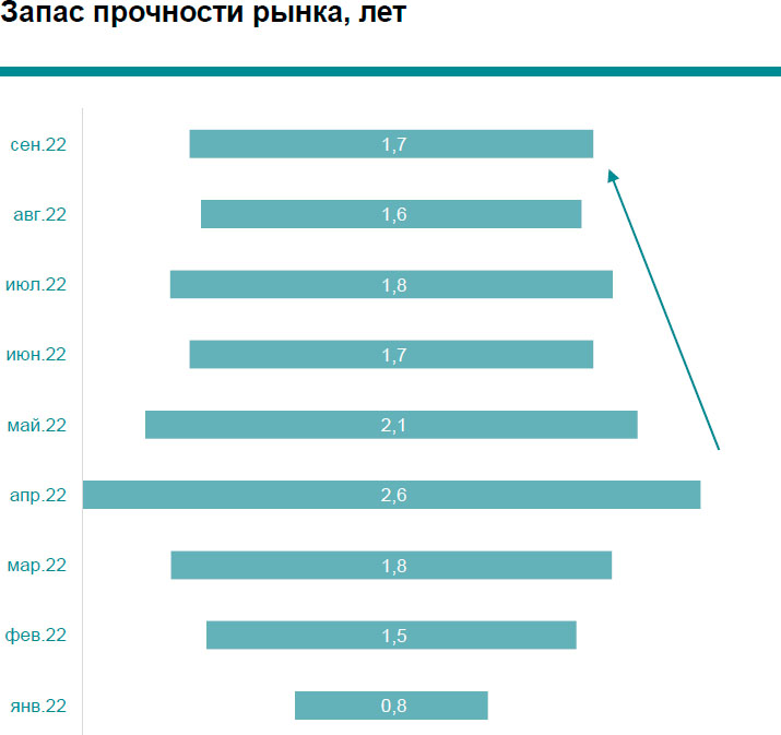 В сравнении с сентябрем прошлого года, запас прочности высокобюджетного рынка аренды Москвы вырос более, чем на полгода : c 1,1 до 1,7 лет. Это то время, которое требуется для сдачи в аренду всех квартир, которые предлагаются в настоящий момент.
