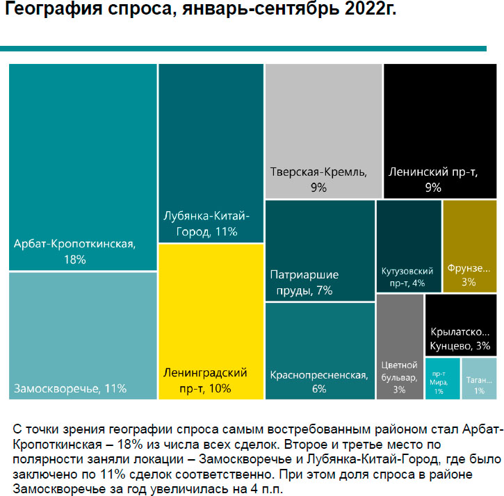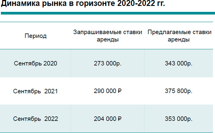 Основной спрос с начала года приходится на бюджет от 100 000 до 200 000 руб. за объект в месяц . На такой диапазон ставок пришлась почти половина спроса по итогам января сентября 2022 года (46%). Доля сделок в диапазоне ставок ниже 300 000 руб. за данный период в сравнении с прошлым годом повысилась на 13 п.п