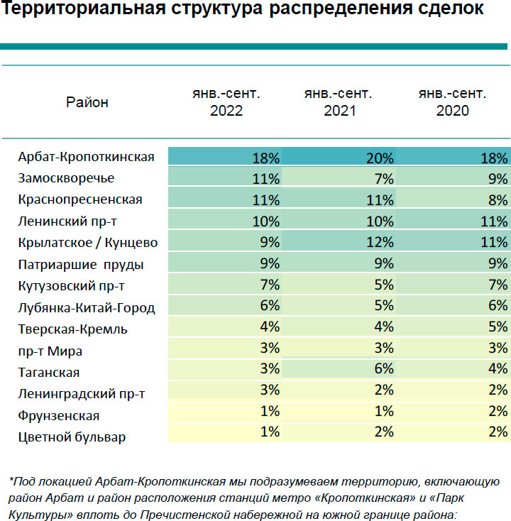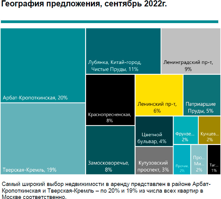 Самые дорогие элитные квартиры для аренды расположены в районе Арбат Кропоткинской. Средний бюджет предложения по итогам сентября составил в локации 409 000 руб. за объект в месяц.