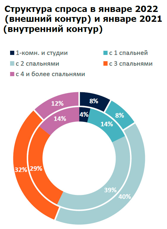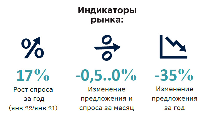 Если рассматривать как изменился спрос с января прошлого года, то можно сделать вывод об его увеличении на 17% (сравниваются показатели в январе 2022 и в январе 2021 года).