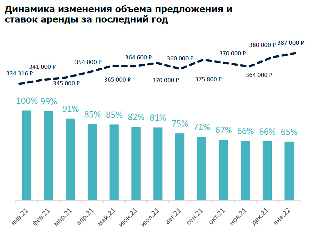 387 000 руб. за объект в месяц – средневзвешенный бюджет предложения на рынке высокобюджетной аренды Москвы в январе 2022 года. За последний месяц ставка продемонстрировала рост на 2%, за год – на 16%.